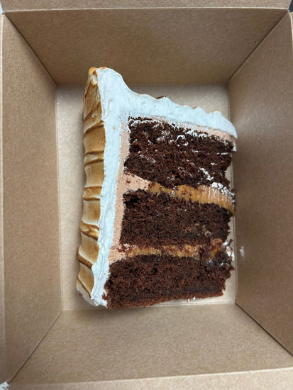 This cake is for all the chocolate lovers out there. It is a 3 layered chocolate cake with a thick salted caramel in-between each layer. It is coated in a chocolate Swiss meringue buttercream and then finished with a light layer of Italian meringue that is lightly toasted.